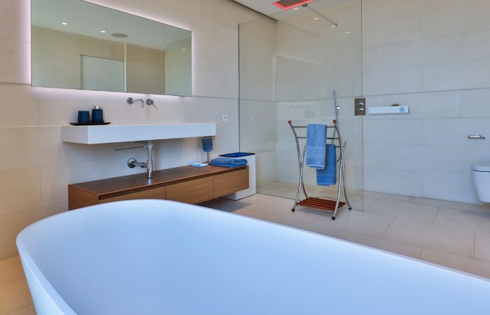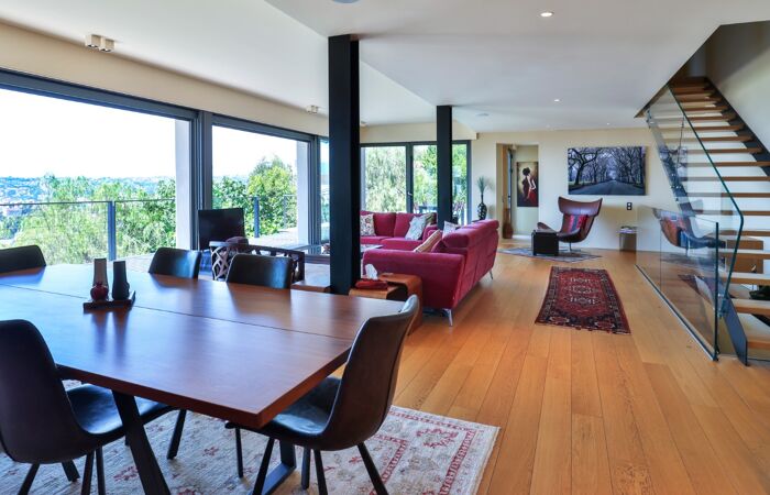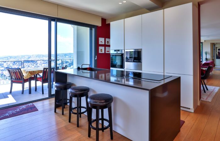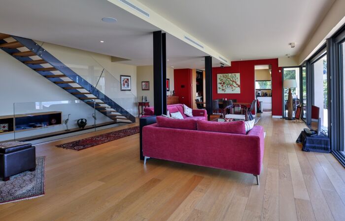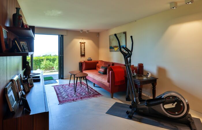 Elle se compose d'un vaste séjour lumineux avec sa cuisine ouverte équipée et aménagée, quatre chambres et quatre salles de bains ainsi qu'un appartement d'invités indépendant de type 2 pièces.
