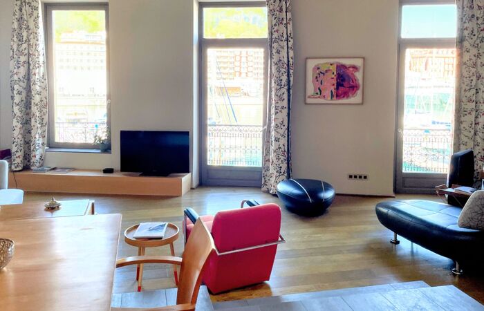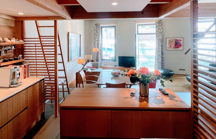 - Un troisième appartement de 98 m² avec séjour et cuisine ouverte donnant sur un balcon filant avec vue directe sur le port, deux chambres, salle de bain, WC invités et une chambre supplémentaire en mezzanine avec salle d'eau et WC.
