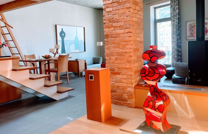 - Un appartement 3 pièces de 106 m² avec un grand séjour/cuisine de 72 m² ouvrant sur un balcon filant et une terrasse de 26 m², le tout avec une vue dégagée exceptionnelle sur le port. À l'étage, une chambre en mezzanine, un bureau (pouvant faire office de chambre), une salle de bain et deux WC.