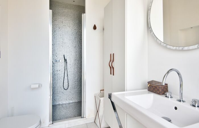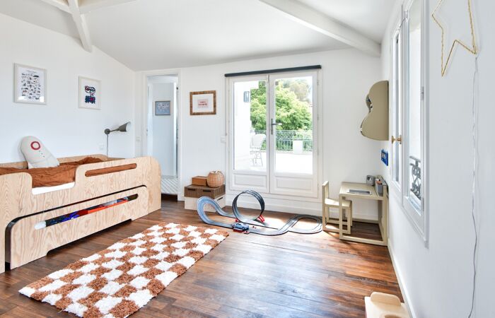 À l'étage, deux chambres en suite avec salles d'eau et wc s'ouvrent sur des balcons avec une magnifique vue mer.