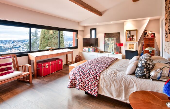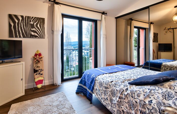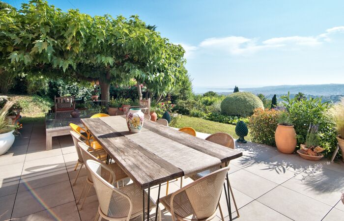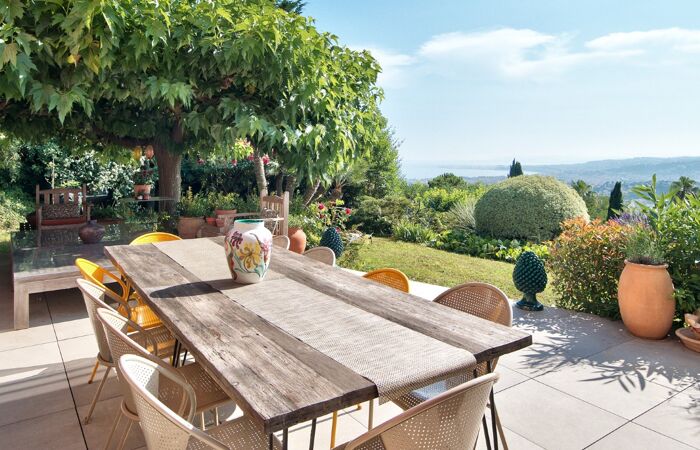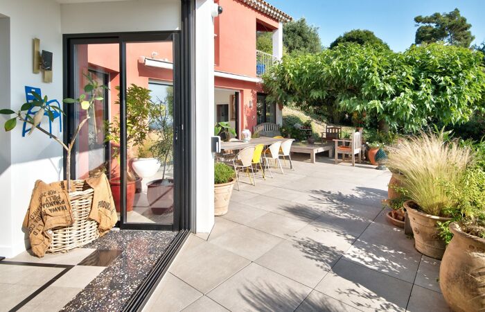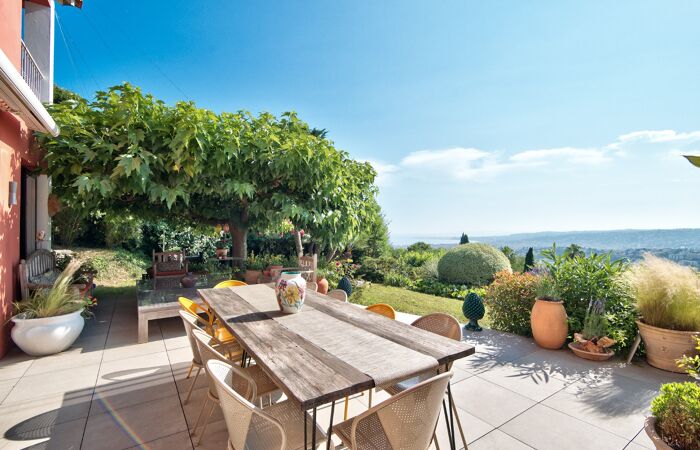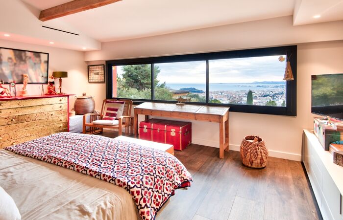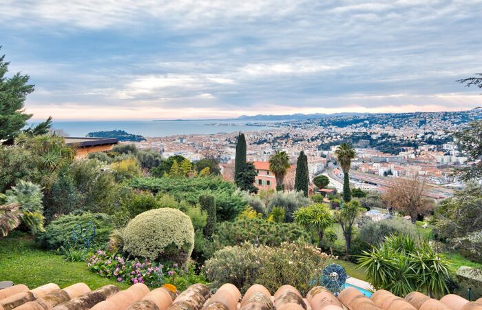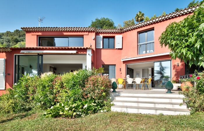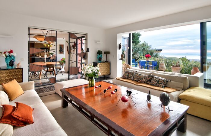 Sur deux niveaux, la maison se compose en rez-de-jardin d'un spacieux double séjour / salle à manger, d'une cuisine américaine moderne entièrement équipée, d'un WC indépendant et d'une chambre indépendante avec salle de bain et WC. Toutes les pièces de vie s'ouvrent sur une vaste terrasse arborée et un jardin offrant une magnifique vue dégagée sur la mer et la ville.