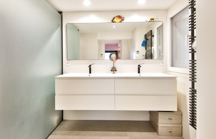 À l'étage, vous trouverez une belle suite parentale avec salle d'eau, WC et dressing, un bureau, ainsi qu'une grande chambre double modulable en deux chambres séparées. Une seconde salle d'eau avec WC complète l'espace nuit.
