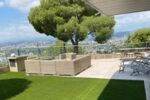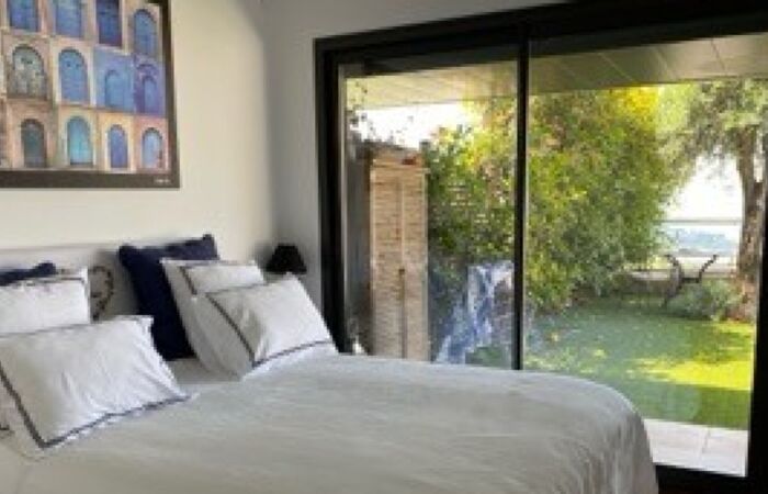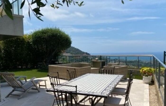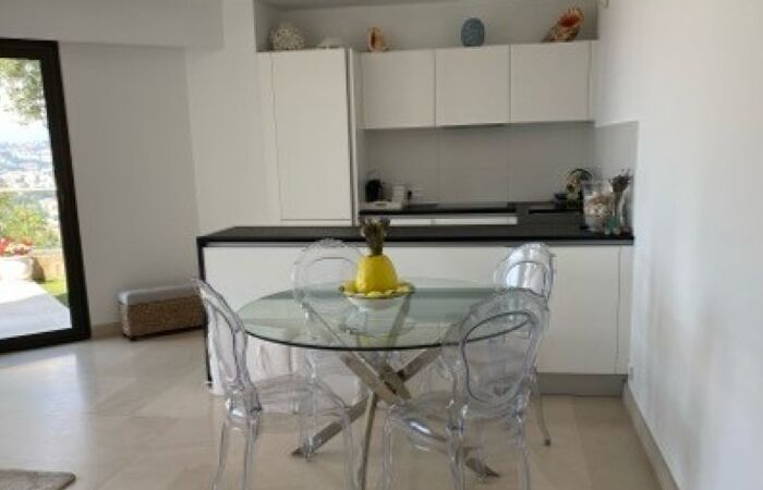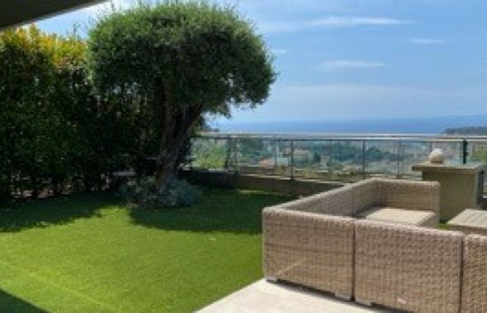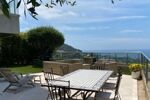 Une terrasse, un jardin avec vue mer et montagnes ainsi qu'un garage fermé en sous sol viennent compléter cette location.