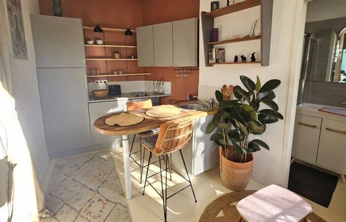 Cet appartement d'une surface de 23 m² se compose d'une cuisine américaine avec un espace pour déjeuner, d'une chambre climatisée et d'une salle de douche avec WC
