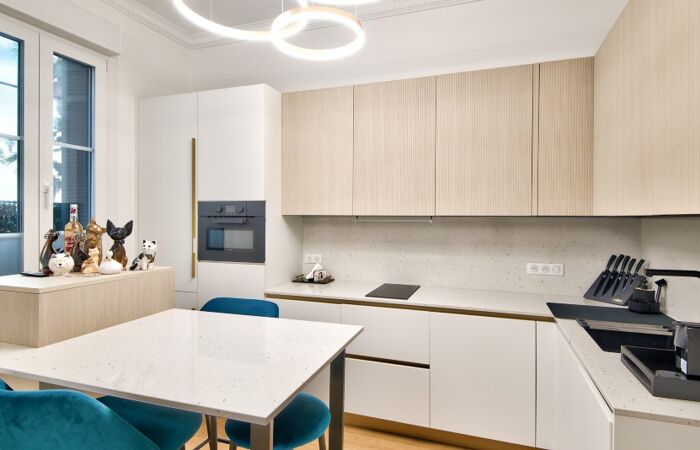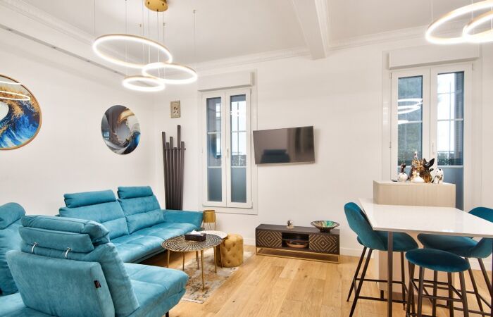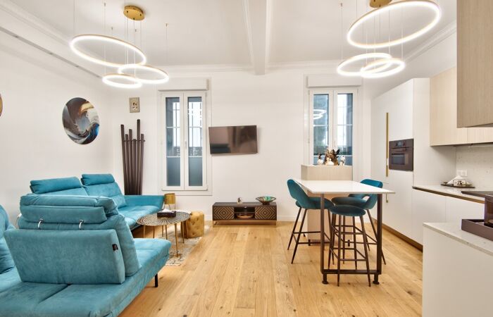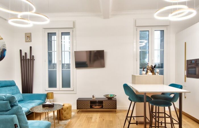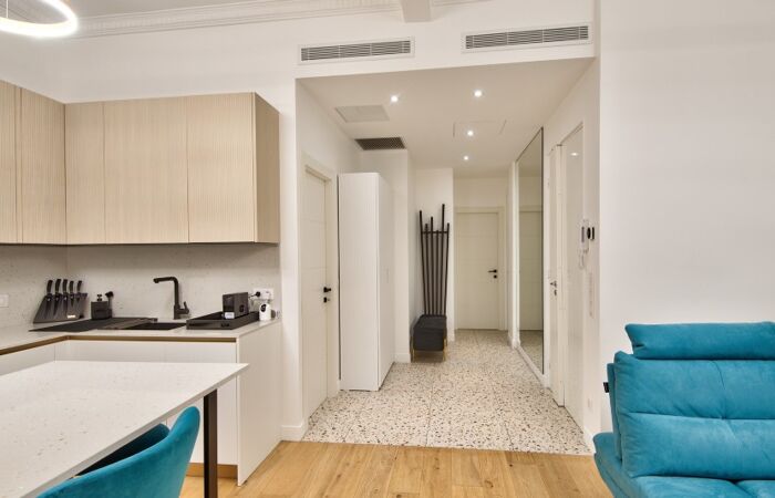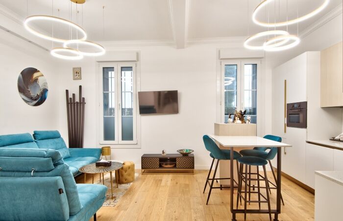 Exceptionnel appartement de 2 chambres et 2 salles de bains, entièrement rénové, situé au rez-de-chaussée de la célèbre Promenade des Anglais, à deux pas de la mer. Le séjour spacieux avec cuisine ouverte offre un cadre de vie moderne et confortable.