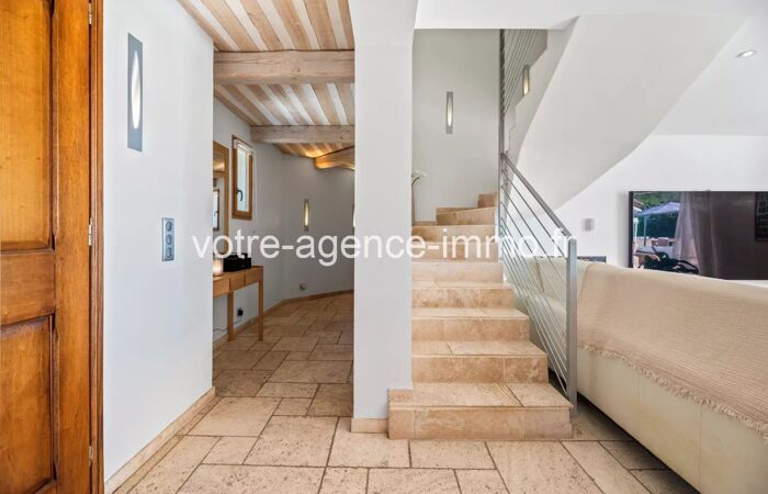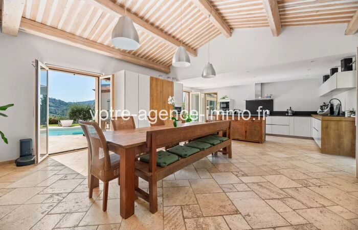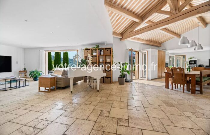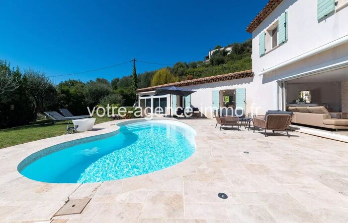 LEVENS – EXCLUSIVITE - Superbe villa provençale 243 m² avec piscine, jacuzzi et vue panoramique EXCLUSIVITÉ – LEVENS Élégante villa provençale contemporaine de 243 m² env avec piscine chauffée, jacuzzi et vues panoramiques À seulement 30 minutes de Nice, au cœur d’un environnement préservé et recherché de la commune de Levens, cette villa récente (2014) développe 243 m² habitables env au sein d’une parcelle paysagée de 2 000 m² env, offrant un calme absolu, sans aucun vis-à-vis. Cette propriété de standing séduit immédiatement par la qualité de ses volumes, la fluidité de sa circulation intérieure et une organisation idéale pour une grande famille ou une vie intergénérationnelle, grâce à trois espaces nuit parfaitement indépendants, garantissant intimité et confort à chacun. La pièce de réception, d’environ 100 m², constitue le cœur de la maison : un espace majestueux, baigné de lumière naturelle, prolongé par de larges ouvertures sur une vaste terrasse offrant une vue panoramique sur la campagne environnante, avec un léger aperçu mer. L’atmosphère y est à la fois chaleureuse, élégante et résolument tournée vers l’extérieur. La villa propose cinq chambres, dont une suite parentale, ainsi que deux salles d’eau et une salle de bain avec WC, réparties de manière harmonieuse au sein des différents espaces nuit, assurant une parfaite indépendance et un calme absolu en toute circonstance. Les prestations sont à la hauteur du lieu : chauffage au sol, climatisation, double vitrage, matériaux de qualité et finitions soignées, offrant un confort de vie optimal en toutes saisons. À l’extérieur, les espaces ont été pensés comme une véritable invitation à la détente et à la convivialité : piscine chauffée, jacuzzi, terrasses généreuses et zones de réception intimistes, le tout dans un cadre naturel préservé, à l’abri de tout regard. La propriété dispose également d’une borne de recharge pour véhicule électrique et d’un stationnement aisé pour 4 à 8 véhicules au sein de la parcelle. Un bien rare, conjuguant espace, lumière, sérénité et prestations haut de gamme, à quelques minutes des commodités de Levens et à proximité immédiate de Nice.