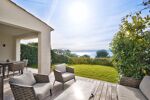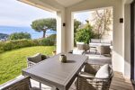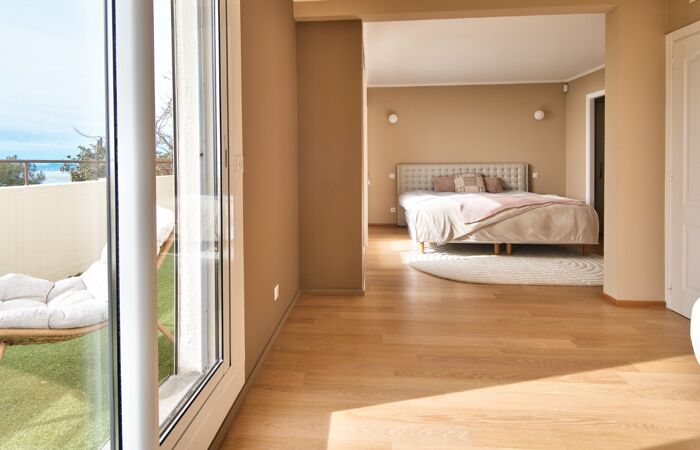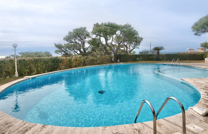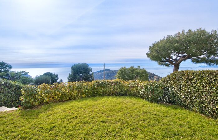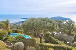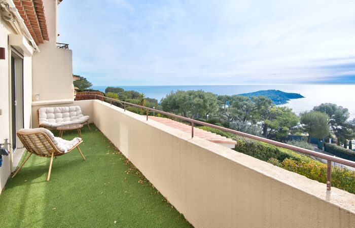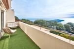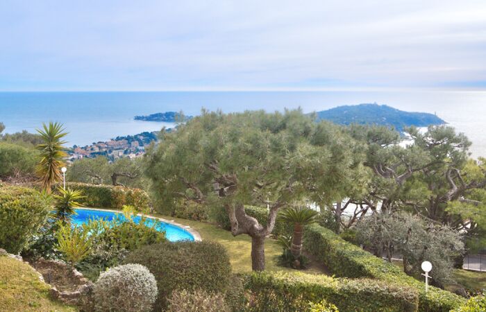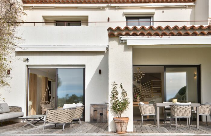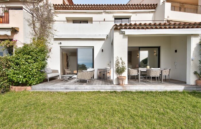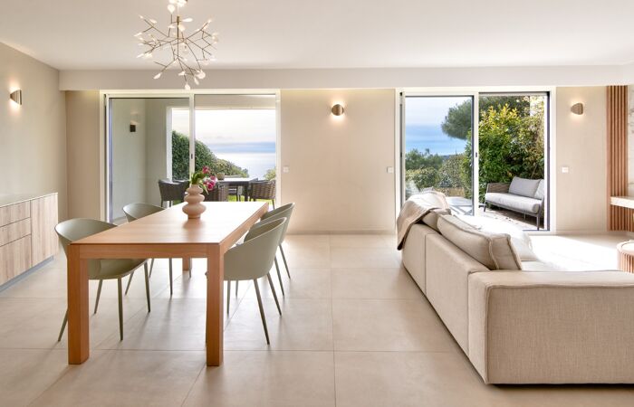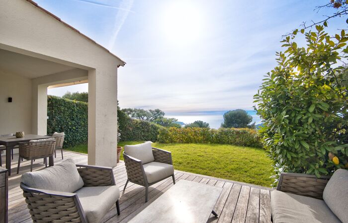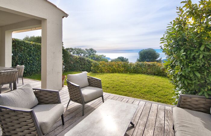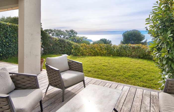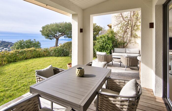 Il comprend, un grand séjour lumineux s'ouvrant sur un jardin très bien entretenu et une terrasse, jouissant d'une vue panoramique sur la mer. Une cuisine aménagée et équipée ainsi qu'une chambre avec salle d'eau et wc. À l'étage, un palier dessert deux chambres, une salle d'eau et une salle de bain avec wc. L'appartement bénéficie de trois terrasses et se situe dans une petite copropriété de grand standing avec gardien et piscine.