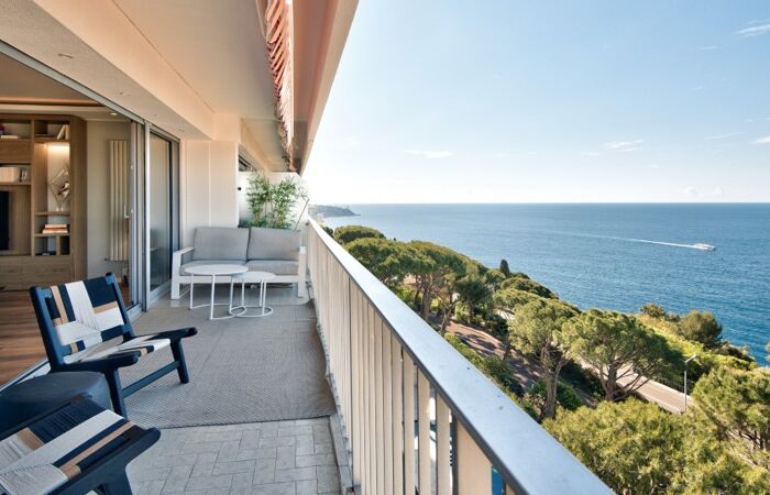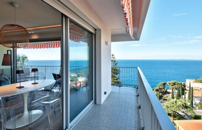Appartement de 3 pièces d'environ 95 mètres carrés avec terrasse de 32 mètres carrés, situé dans une résidence avec piscine, parking et vue mer panoramique.