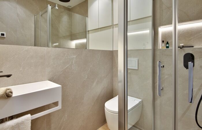 Il se compose d'une entrée, d'un séjour avec salle à manger, d'une cuisine ouverte, d'une chambre parentale, d'une chambre d'amis avec lit escamotable pouvant servir de bureau, et de deux salles d'eau avec WC.