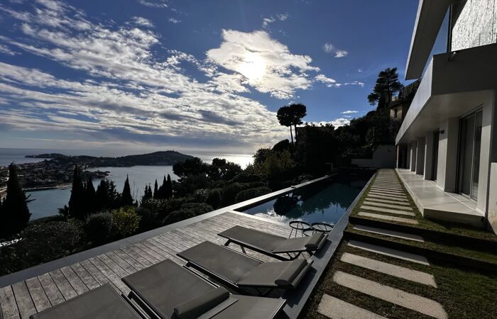VILLEFRANCHE-SUR-MER - VILLA Une magnifique Villa de 360 m2 à Villefranche-sur-mer avec une vue mer sur Saint-Jean-Cap-Ferrat et la rade de Villefranche. Un grand séjour lumineux avec une cuisine ouverte donnant sur une grande terrasse de 30 m2. Une chambre avec sa buanderie et sa salle de bain. 4 chambres au rez-de-jardin, chacune avec sa propre salle de bain et une ouverture donnant sur la piscine. Un hammam, un pool house. Grande piscine avec sa plage et son salon très agréable. Un appartement de 48m2 pour le personnel de maison. Ainsi que 4 places de stationnement. Location meublé à la semaine, au mois ou à l'année.