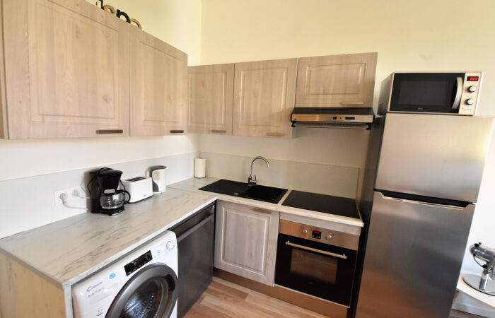 Appartement de 3 pièces principales. Meublé. 37m2. Comprenant : une entrée, un séjour / cuisine aménagée et équipée (plaque de cuisson hotte aspirante four lave vaisselle réfrigérateur / congélateur lave linge), 2 chambres (lit commode bureau portant) et une salle d'eau / WC.