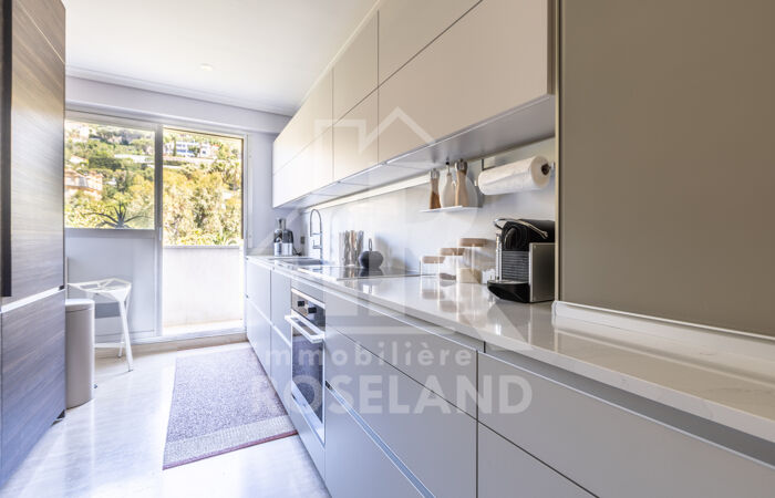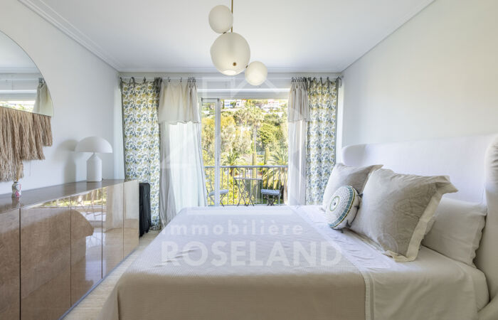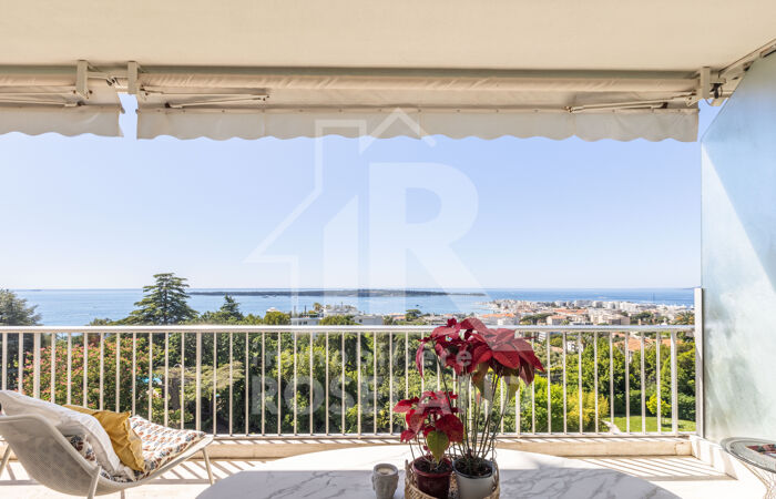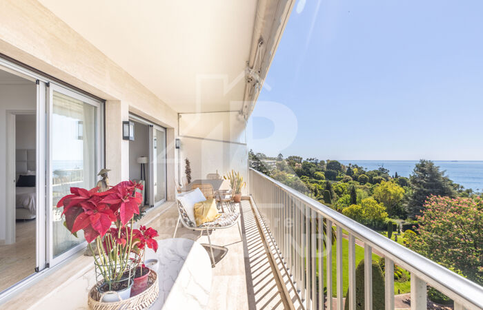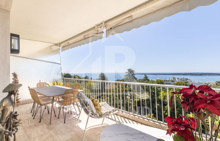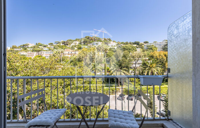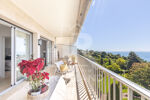 Terrasse de 18 m2. Exposée plein Sud. Somptueuse vue dégagée sur la verdure, la mer et les iles de Lérins.