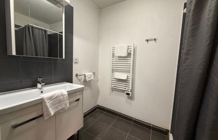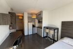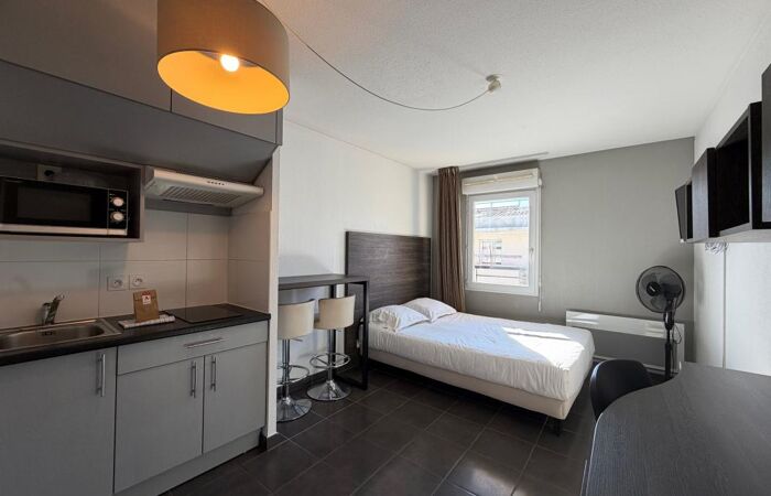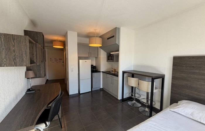Studio meublé de 21,46 m², situé en dernier étage, comprenant une pièce principale avec kitchenette équipée, coin nuit, salle d'eau avec WC, chauffage individuel électrique, double vitrage et sol PVC facile d'entretien.