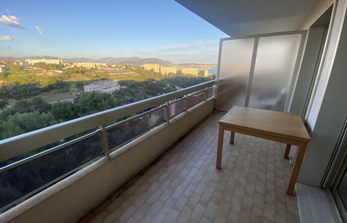 Terrasse de 9 m2. Vue dégagée sur les collines et aperçu sur la mer.